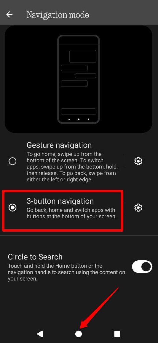 - When the ” Circle to search appears in the search result, tap on it to access the section where this setting is available. (Usually in the navigation settings)