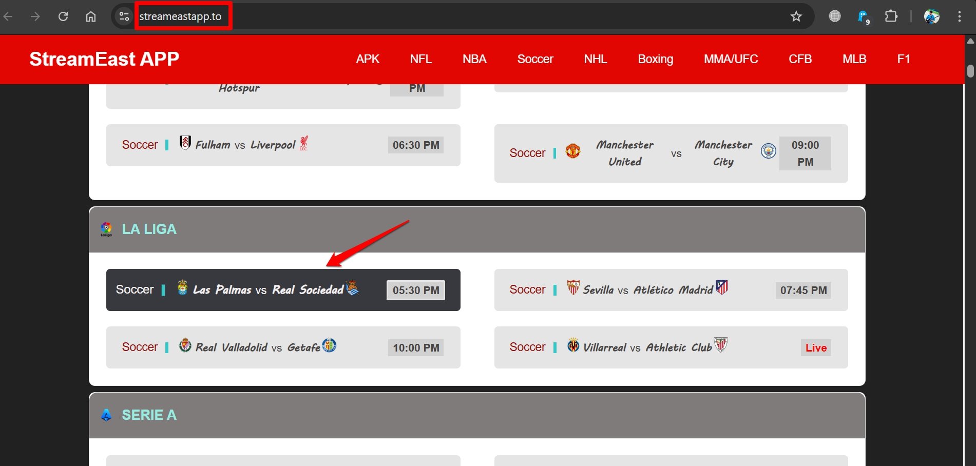 This website is pretty simple to navigate and offers the streaming of limited types of sports. On StremEast, you can watch UFC, MMA, F1, Soccer, NFL, NBA, NHL, CFB, etc.